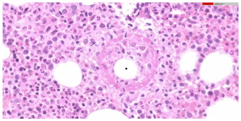 A 71-year-old man presented to the emergency department with 3 weeks of fever, asthenia and night sweats. The initial laboratory results showed mild anaemia, thrombocytopenia and elevated C-reactive protein, with normal liver enzymes. The remaining initial study was unremarkable. Due to haematologic abnormalities, a bone marrow biopsy was performed, revealing multiple ring epithelioid granulomas, consisting of a central lipid vacuole surrounded by epithelioid cells and some neutrophils. These findings, although not pathognomonic, favoured the diagnosis of Q fever with isolated bone marrow involvement. The diagnosis was later confirmed by seroconversion and exclusion of other causes for this histopathologic finding. The patient was treated with doxycycline for fourteen days with a good response and no evidence of the disease after six months.